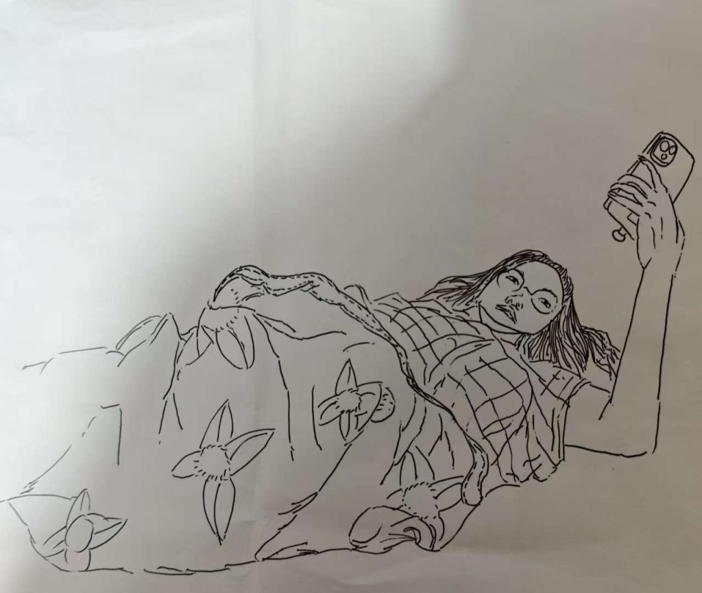 Bức vẽ phác họa hình ảnh một người phụ nữ đang cúi gập người, chăm chú nhìn vào điện thoại, mái tóc buông xuống che gần hết khuôn mặt. Điều khiến đoạn video trở nên hài hước chính là sự “tả thực” đến mức khó tin, từ dáng ngồi gù lưng, tư thế cắm cúi cho đến thần thái đều được cô bé tái hiện lại một cách rất chi tiết.
