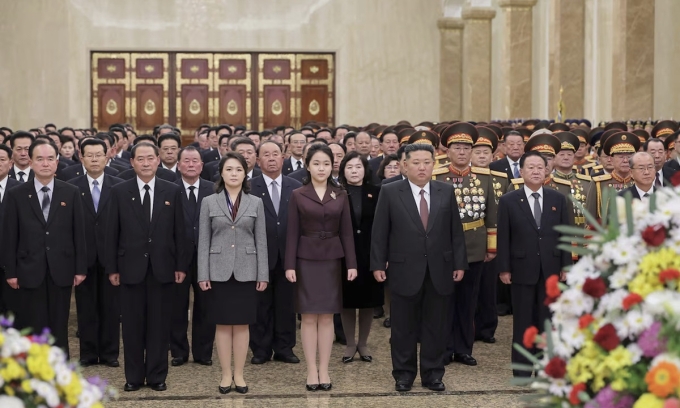 Ảnh do hãng thông tấn trung ương Triều Tiên KCNA đăng tải hôm nay cho thấy Kim Ju-ae xuất hiện bên cạnh cha mẹ cùng các quan chức cấp cao Triều Tiên tại sảnh chính Cung điện Mặt trời Kumsusan trong chuyến thăm ngày 1/1.