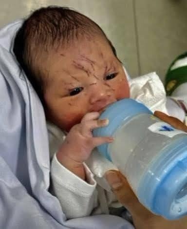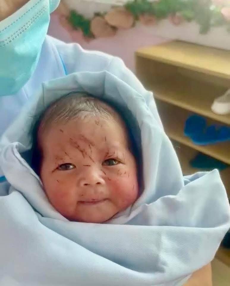 Trên mặt của bé có nhiều vết xước, tay và chân xuất hiện các nốt đỏ nghi do côn trùng cắn. Bé được tiêm kháng sinh để phòng nhiễm trùng, thở ôxy, truyền dịch nuôi dưỡng. Sức khỏe của bé đã ổn định và đang được các bác sĩ theo dõi đặc biệt.
