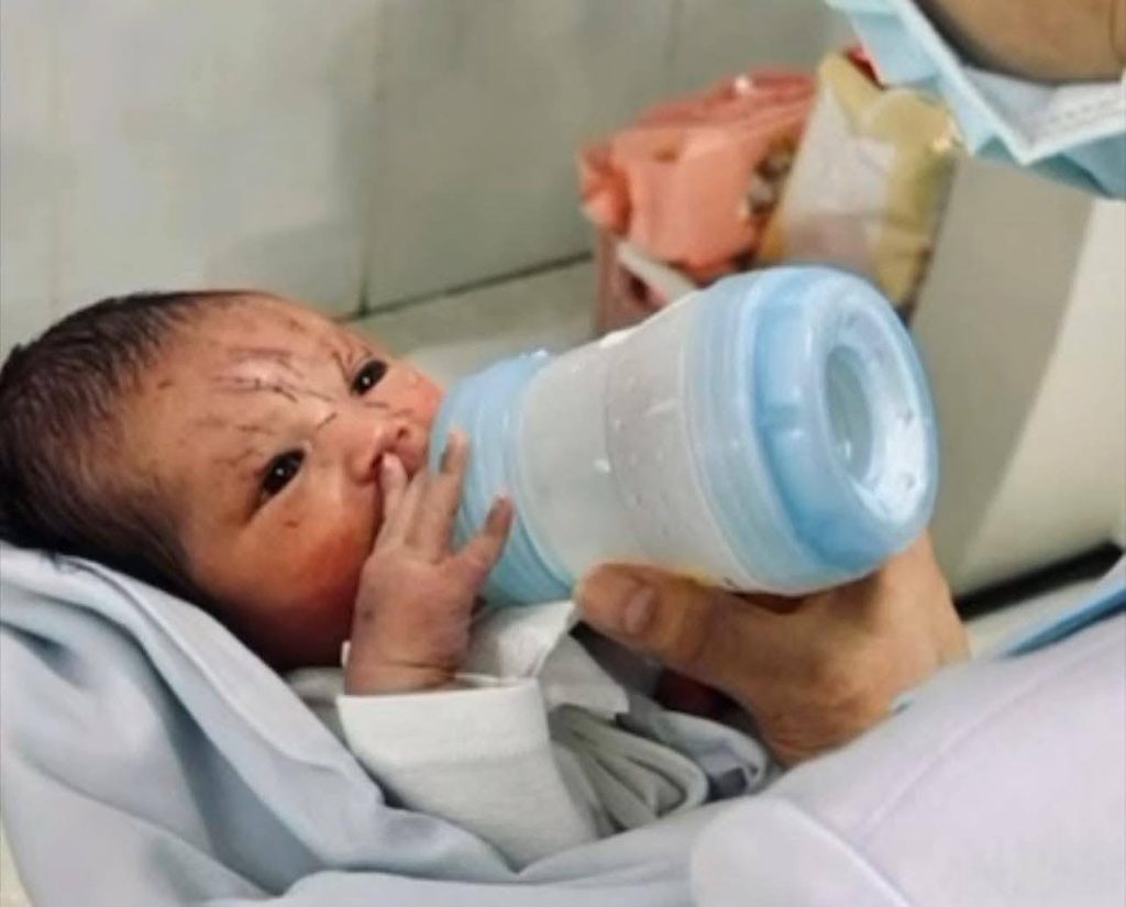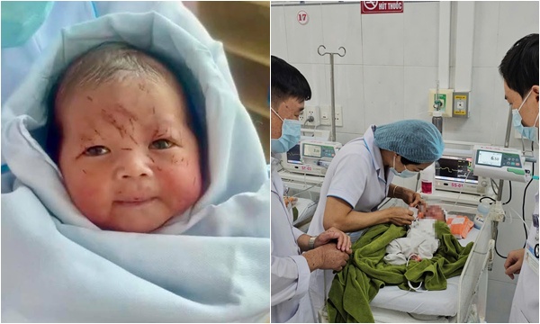 Trên mặt của bé có nhiều vết xước, tay và chân xuất hiện các nốt đỏ nghi do côn trùng cắn. Bé được tiêm kháng sinh để phòng nhiễm trùng, thở ôxy, truyền dịch nuôi dưỡng. Sức khỏe của bé đã ổn định và đang được các bác sĩ theo dõi đặc biệt.