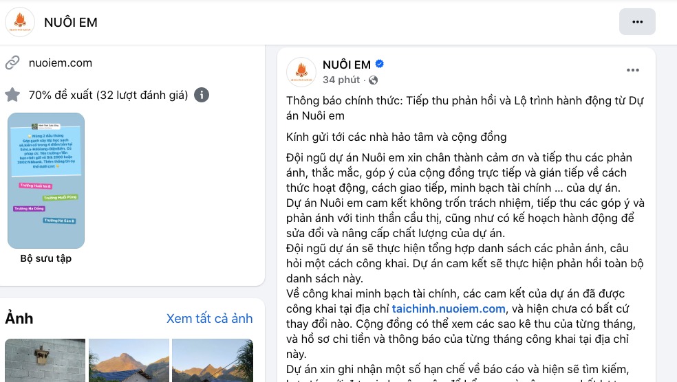 “Dự án cam kết không trốn trách nhiệm, tiếp thu các góp ý và phản ánh với tinh thần cầu thị, cũng như có kế hoạch hành động để sửa đổi và nâng cấp chất lượng của dự án”- phía dự án “Nuôi em” nêu rõ.