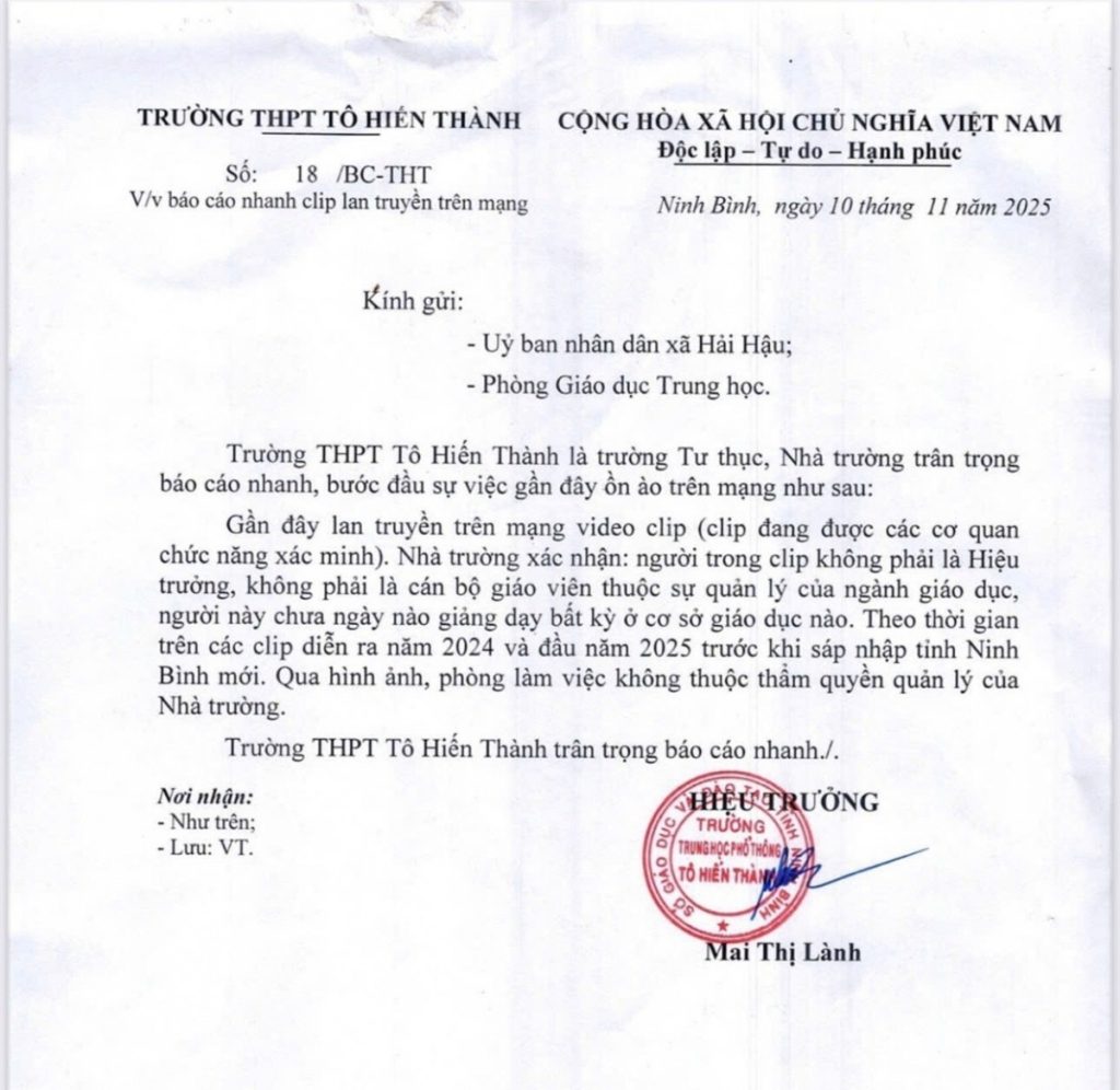 Liên quan đến vụ việc, Trường THPT Tô Hiến Thành – ngôi trường được cho là nơi xảy ra vụ việc – đã phát đi báo cáo nhanh gửi Ủy ban nhân dân xã Hải Hậu và Phòng Giáo dục Trung học (Sở GD&ĐT Ninh Bình). Trong báo cáo, nhà trường khẳng định: “Người trong clip không phải là Hiệu trưởng, không phải là cán bộ, giáo viên thuộc sự quản lý của ngành giáo dục. Người này chưa từng giảng dạy tại bất kỳ cơ sở giáo dục nào. Theo thời gian trên các clip, sự việc diễn ra vào năm 2024 và đầu năm 2025, trước khi sáp nhập tỉnh Ninh Bình mới. Qua hình ảnh, phòng làm việc xuất hiện trong clip không thuộc thẩm quyền quản lý của nhà trường”.