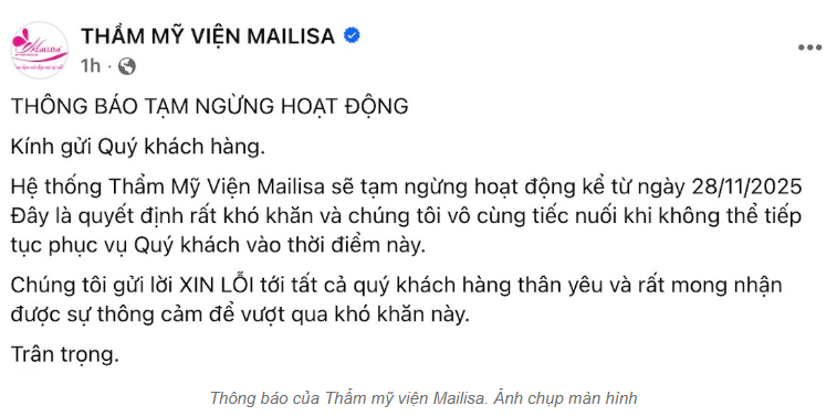 Thông qua trang Facebook chính thức có hơn 2,8 triệu tài khoản theo dõi, hệ thống thẩm mỹ viện Mailisa đưa ra thông báo vào tối nay 27-11 về việc chính thức tạm ngừng hoạt động kể từ ngày mai 28-11. Đồng thời không nêu bất kỳ nội dung nào liên quan đến việc hẹn ngày trở lại cụ thể.