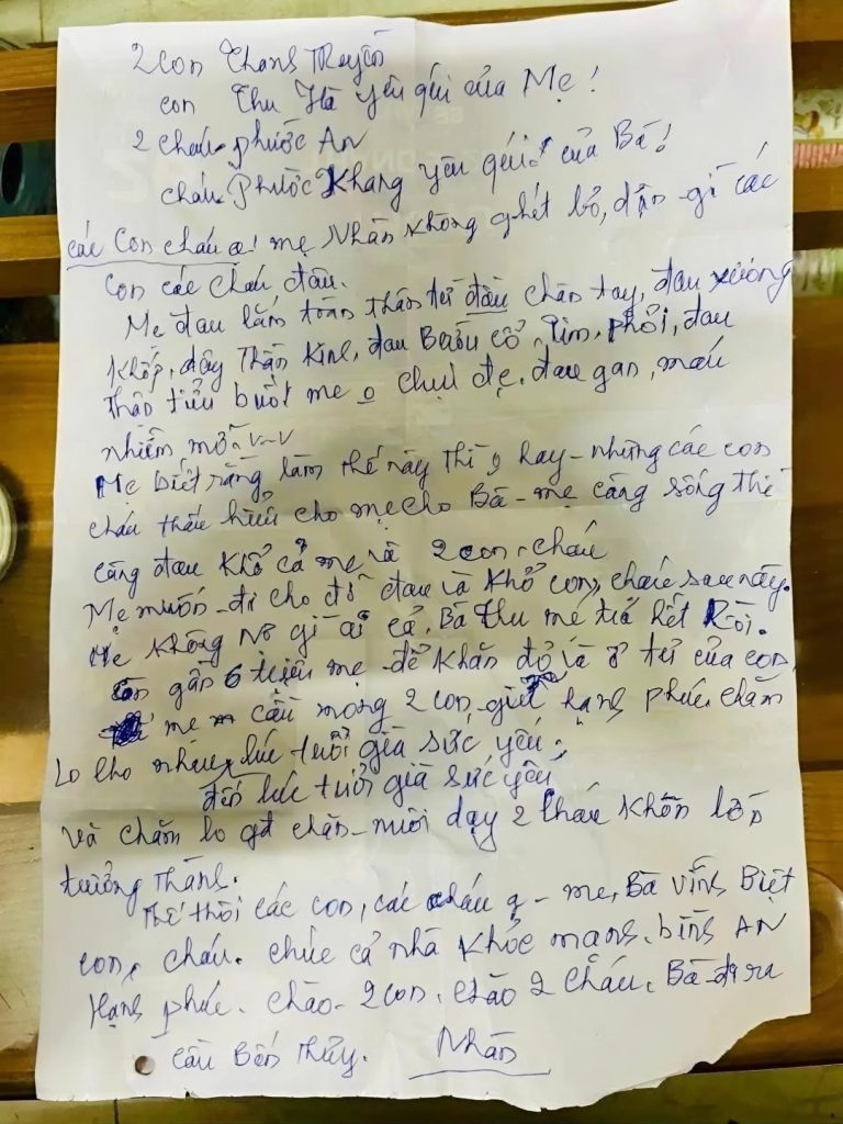 Người nhà nạn nhân sau đó tiết lộ đã tìm thấy một bức thư như lời tuyệt mệnh người phụ nữ để lại. Trong đó là những lời căn dặn, xin lỗi con cháu. Người phụ nữ còn cho biết mình quyết định kết thúc cuộc đời vì quá đau đớn bởi bệnh tật.