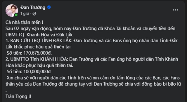 Theo diễn biến mới nhất, sáng 25/11, Đan Trường thông báo đã khóa tài khoản và hoàn tất việc chuyển tiền đến các địa phương. Theo đó, anh và người hâm mộ ủng hộ tỉnh Đắk Lắk hơn 170 triệu đồng và Khánh Hòa 100 triệu đồng. Nam ca sĩ cũng công khai chứng từ ủy nhiệm chi lập ngày 25/11/2025 kèm theo bài đăng.