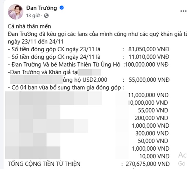 Tối 24/11, ca sĩ Đan Trường đăng tải công khai bản sao kê tài khoản ngân hàng, khẳng định sự minh bạch trong hoạt động quyên góp vừa thực hiện. Tổng số tiền tiếp nhận được là 268 triệu đồng, trong đó anh đóng góp 100 triệu đồng.